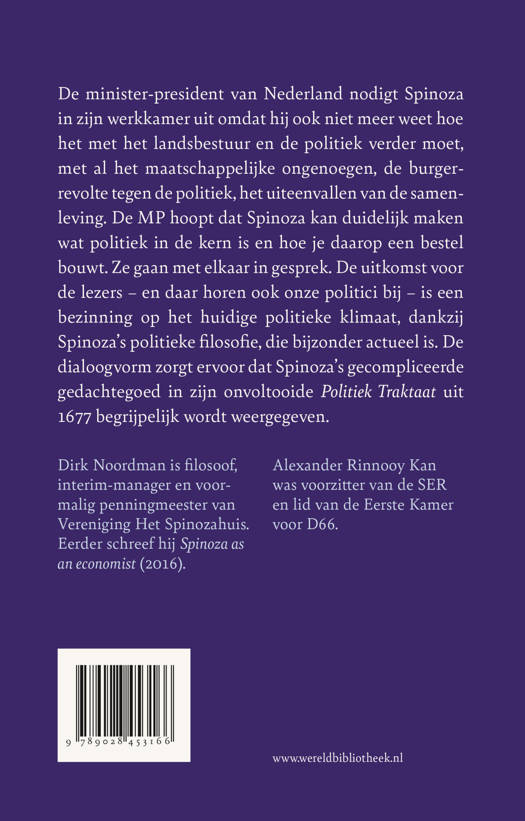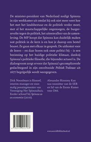 Mark Rutte nodigt Spinoza uit voor een bezoek in het Torentje en praat met hem over het functioneren van de politiek en de verslechterende verhouding tussen de bevolking en de overheid, want Spinoza's gedachten daarover zijn nog altijd hoogst actueel; een dergelijk gesprek zou Rutte zijn voordeel kunnen doen. 'Mark,' zou Spinoza tegen Rutte zeggen, 'jouw regering heeft alleen recht van bestaan als ze zorgt voor een overheid die uit is op algemeen welzijn, want dat leidt tot interne vrede en begrip voor elkaar. Dat je wetten nodig hebt voor het in bedwang houden van de egoïstische en irrationele mens is duidelijk. Maar die wetten moeten zo goed zijn dat ze langdurig kunnen blijven bestaan. Ze moeten niet straffen en angst inboezemen, ze moeten de bevolking juist de kans geven uit te blinken.' Deze en andere ideeën heeft Spinoza op schrift gesteld in het Theologisch-politiek traktaat (1670) en vooral in de onvoltooid gebleven Staatkundige verhandeling waaraan hij werkte toen hij in 1677 door de dood werd verrast. Het is een flinke kluif die te doorgronden. Dirk Noordman heeft haar uitgeplozen en helder en toegankelijk samengevat in dit boek. Net zoals Jan Knol met Spinoza's Ethica heeft gedaan.