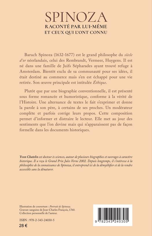 Baruch Spinoza (1632-1677) est le grand philosophe du siècle d’or néerlandais, celui des Rembrandt, Vermeer, Huygens. Il est né dans une famille de Juifs Sépharades ayant trouvé refuge à Amsterdam. Bientôt exclu de sa communauté pour ses idées, celui qui était destiné au commerce s’en échappe pour une vie retirée. Son oeuvre principale est intitulée Éthique. Plutôt que par une biographie conventionnelle, il est présenté sous forme romancée et humoristique, conforme à la vérité de l’Histoire. Une alternance de textes le fait s’exprimer et donne la parole à son père, à certains de ses proches. Un modérateur complète et parfois corrige leurs propos. Cette composition permet d’informer et distraire le lecteur. Elle met au jour des sentiments que l’on devine mais qui n’apparaissent pas de façon formelle dans les documents historiques.