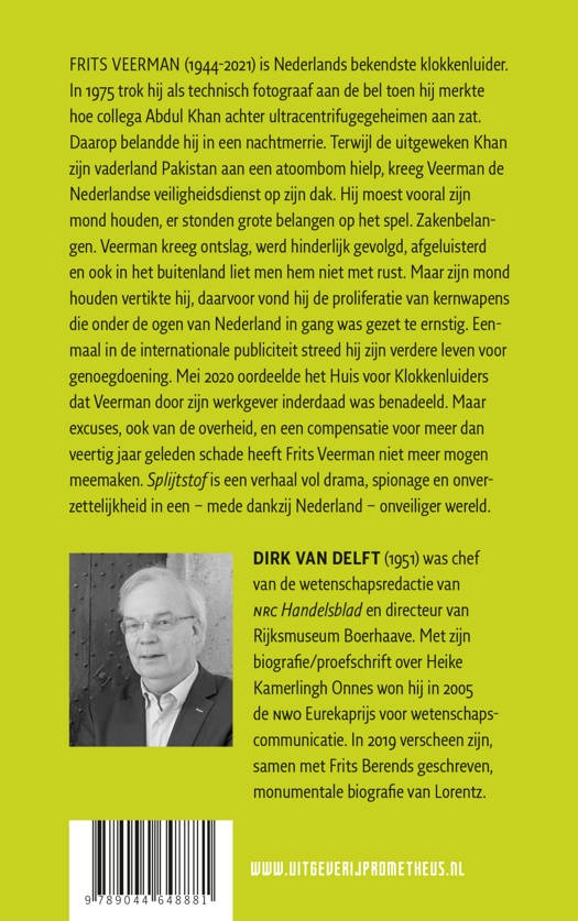 Frits Veerman (1944-2021) is Nederlands bekendste klokkenluider. In 1975 trok hij als technisch fotograaf aan de bel toen hij merkte hoe collega Abdul Khan achter ultracentrifugegeheimen aan zat. Daarop belandde hij in een nachtmerrie. Terwijl de uitgeweken Khan zijn vaderland Pakistan aan een atoombom hielp, kreeg Veerman de Nederlandse veiligheidsdienst op zijn dak. Hij moest vooral zijn mond houden, er stonden grote belangen op het spel. Zakenbelangen. Veerman kreeg ontslag, werd hinderlijk gevolgd, afgeluisterd en ook in het buitenland liet men hem niet met rust. Maar zijn mond houden vertikte hij, daarvoor vond hij de proliferatie van kernwapens die onder de ogen van Nederland in gang was gezet te ernstig. Eenmaal in de internationale publiciteit streed hij zijn verdere leven voor genoegdoening. Mei 2020 oordeelde het Huis voor Klokkenluiders dat Veerman door zijn werkgever inderdaad was benadeeld. Maar excuses, ook van de overheid, en een compensatie voor meer dan veertig jaar geleden schade heeft Frits Veerman niet meer mogen meemaken. Splijtstof is een verhaal vol drama, spionage en onverzettelijkheid in een – mede dankzij Nederland – onveiliger wereld.