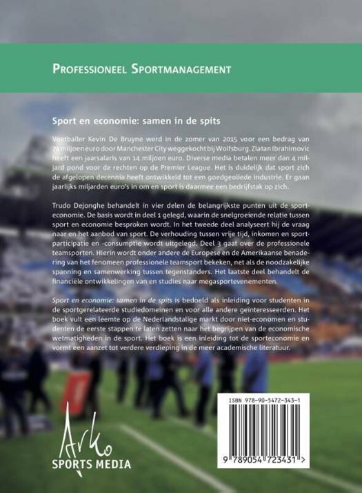 Trudo Dejonghe behandelt in vier delen de belangrijkste punten uit de sport- economie. De basis wordt in deel 1 gelegd, waarin de snelgroeiende relatie tussen sport en economie besproken wordt. In het tweede deel analyseert hij de vraag naar en het aanbod van sport. De verhouding tussen vrije tijd, inkomen en sport- participatie en -consumptie wordt uitgelegd. Deel 3 gaat over de professionele teamsporten. Hierin wordt onder andere de Europese en de Amerikaanse benade- ring van het fenomeen professionele teamsport bekeken, net als de noodzakelijke spanning en samenwerking tussen tegenstanders. Het laatste deel behandelt de financie¨le ontwikkelingen van en studies naar megasportevenementen.
