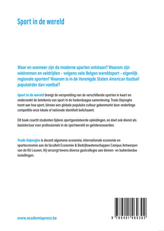 Waar en wanneer zijn de moderne sporten ontstaan? Waarom zijn wielrennen en veldrijden - volgens vele Belgen wereldsport - eigenlijk regionale sporten? Waarom is in de Verenigde Staten American football populairder dan voetbal? Sport in de wereld brengt de verspreiding van de verschillende sporten in kaart en onderzoekt de betekenis van sport in de hedendaagse samenleving. Trudo Dejonghe toont aan hoe sport, binnen een globale populaire cultuur gekenmerkt door onderlinge competitie onze lokale of nationale identiteit belichaamt. Dit boek coacht studenten tijdens sportgerelateerde opleiding, en doet ook dienst als basislectuur voor professionals in de sportwereld en geïnteresseerden.