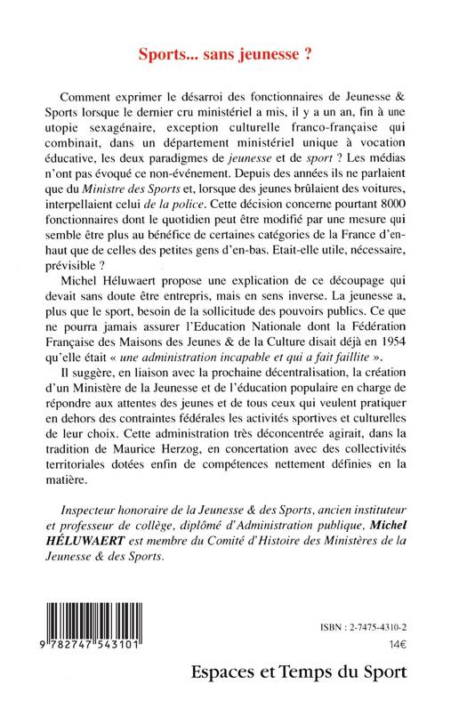 Comment exprimer le désarroi des fonctionnaires de Jeunesse et Sport lorsque le dernier cru ministériel a mis fin, il y a un an, à une utopie sexagénaire, exception culturelle franco-française qui combinait, dans un département ministériel unique à vocation éducative, les deux paradigmes de "Jeunesse " et de "sport"? L'auteur propose une explication de ce découpage. Il suggère, en liaison avec la prochaine décentralisation, la création d'un Ministère de la Jeunesse et de l'éducation populaire en charge de répondre aux attentes des jeunes.