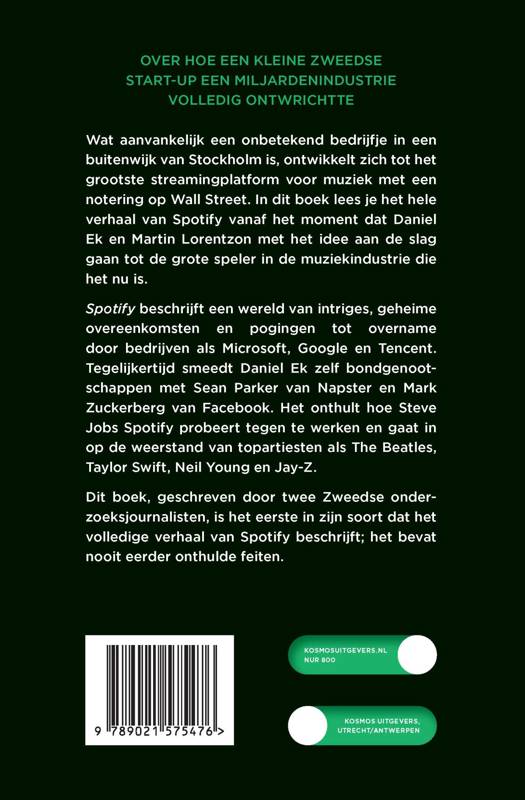 Spotify gaat over hoe een kleine Zweedse start-up een miljardenindustrie volledig ontwrichtte en aan de basis stond van streaming. Lees hoe oprichters Daniel Ek en Martin Lorentzon de platenmaatschappijen uiteindelijk redden van de piraten en Apple ertoe bracht van bedrijfsmodel te veranderen. Spotify, geschreven door twee Zweedse onderzoeksjournalisten is het eerste boek in zijn soort met het volledige verhaal van het bedrijf en bevat nooit eerder onthuld materiaal over het maken van spectaculaire deals en de beursgang. Over o.a. Mark Zuckerberg, Steve Jobs, Jay Z, Jimmy Iovine, Sean Parker. En met bijzondere onthullingen over Tidal, Soundcloud, Google en Microsoft.
