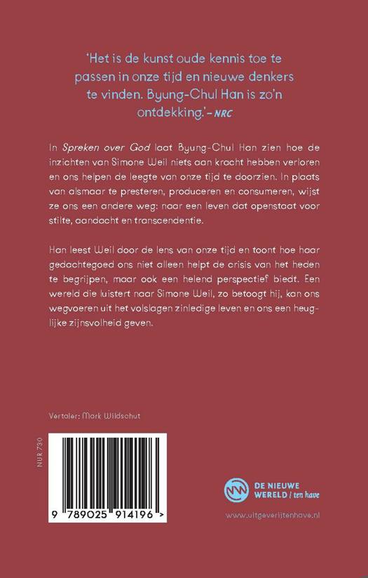 Byung-Chul Han laat in dit indringende essay zien hoe actueel het denken van Simone Weil is. Haar spirituele kracht en radicale kritiek op productie, prestatie en consumptie bieden een helend perspectief op deze tijd. Weil wijst ons een andere weg: naar een leven dat openstaat voor transcendentie, stilte en zin. Volgens Han zou de wereld mooier en vreedzamer zijn als we leefden zoals Weil het voorleefde – vol aandacht, overgave en innerlijke waarheid.