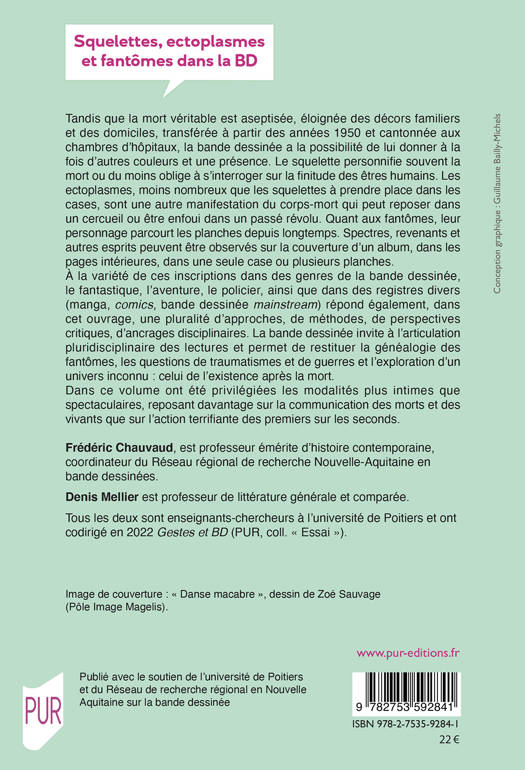 Tandis que la mort véritable est aseptisée, éloignée des décors familiers et des domiciles, transférée à partir des années 1950 et cantonnée aux chambres d’hôpitaux, la bande dessinée a la possibilité de lui donner à la fois d’autres couleurs et une présence. Le squelette personnifie souvent la mort ou du moins oblige à s’interroger sur la finitude des êtres humains. Les ectoplasmes, moins nombreux que les squelettes à prendre place dans les cases, sont une autre manifestation du corps-mort qui peut reposer dans un cercueil ou être enfoui dans un passé révolu. Quant aux fantômes, leur personnage parcourt les planches depuis longtemps. Spectres, revenants et autres esprits peuvent être observés sur la couverture d’un album, dans les pages intérieures, dans une seule case ou plusieurs planches.