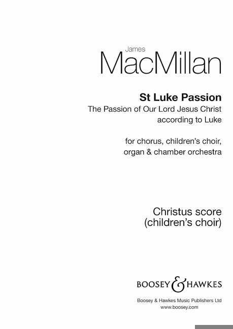(BH Large Choral). Choral part. Scored for chorus, children s choir, organ and chamber orchestra, St Luke Passion adopts a pared-back focus on choral voices over its 75-minute span. Seeking a more spiritual, inward approach to match Luke s text, the composer eschews settings of interpolated texts as arias and the customary Evangelist and Christ soli: everything is sung by choral forces. A children s choir grants a measure of innocence to Christ as the sacrificial lamb, emphasising aspects of otherness, sanctity and mystery. The Passion narrative is framed by a Prelude exploring the Annunciation and a Postlude taking us beyond the Crucifixion to the Resurrection and Ascension. These incorporate Gospel texts where Luke explains the Kingdom of God.