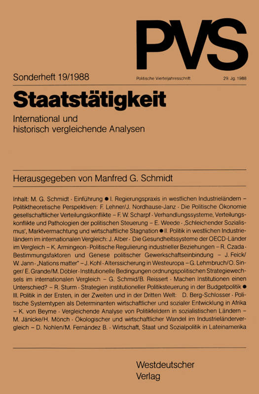 Manfred G. Schmidt Der Begriff Politik umfagt bekanntlich drei Dimensionen: den institutionellen und normativen Rahmen der politischen Ordnung, die sich eine Gesellschaft gegeben hat (im Englischen "polity"), politische Konsensbildungs- und Konfliktprozesse ("politics") und die Inhalte gesamtstaatlich oder bereichsspezifisch verbindlicher Ent- scheidungen ("konkrete Politik", auch "politische Linie", im Englischen "policy"). 1 Politik im Sinne von "policy" - man konnte auch sagen: die Staatstatigkeit - steht im Zentrum dieses Sammelbandes. Er solI insbesondere den Zweig der bundesrepubli- kanischen Policy-Forschung vorstellen, der aus international oder historisch verglei- chender Perspektive geschrieben ist. 1m Unterschied zu einer einflugreichen - vornehmlich anglo-amerikanischen - Varian- te der Policy-Forschung, bei der praxisnahe management- oder verwaltungswissen- schaftlich orientierte Analysen den Ton angeben, werden Staatstatigkeiten in diesem Sammelband aus politikwissenschaftlicher Perspektive untersucht. Policy-Analyse wird hier nicht losgelost von politis chen Konflikt- und Konsensprozessen und politisch-in- stitutionellen Rahmenbedingungen betrieben, sondern in engster Verknupfung mit den Verfahrensregeln, Institutionen und Willensbildungsprozessen der Politik. So verstan- den ist die Analyse von Staatstatigkeiten integraler Bestandteil - und nicht etwa ein Nebengleis - der Politikwissenschaft (Hartwich 1985).