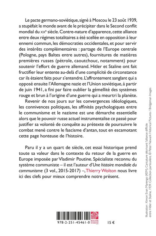 Le pacte germano-sovietique, signe a Moscou le 23 aout 1939, a stupefait le monde avant de le precipiter dans le Second conflit mondial du xxe siecle. Contre-nature d'apparence, cette alliance entre deux regimes totalitaires a ete scellee en opposition a leur ennemi commun, les democraties occidentales, et pour servir des interets complementaires: partage de l'Europe centrale (Pologne, pays Baltes entre autres), fournitures de matieres premieres russes (petrole, caoutchouc, notamment) pour soutenir l'effort de guerre allemand. Hitler et Staline ont fait fructifier leur entente au-dela d'une complicite de circonstance car ils etaient faits pour s'entendre. L'affrontement sanglant qui a oppose ensuite l'Allemagne nazie et l'Union sovietique, a partir de juin 1941, a fini par faire oublier la gemellite des systemes rouge et brun a l'origine d'une guerre qui a meurtri la planete. Revenir de nos jours sur les convergences ideologiques, les connivences politiques, les affinites psychologiques entre le communisme et le nazisme est une demarche essentielle alors que le pouvoir russe actuel instrumentalise ce passe pour justifier sa volonte de conquete au pretexte de poursuivre le combat mene contre le fascisme d'antan, tout en escamotant cette page honteuse de l'histoire.