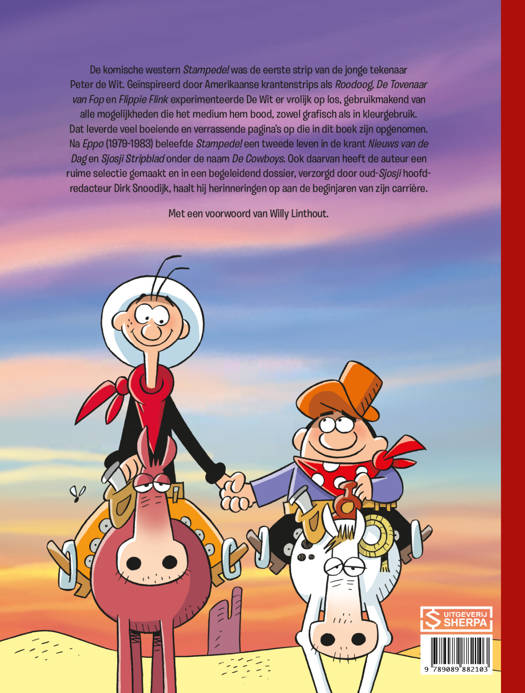 Reguliere editie.....De komische western Stampede! stond van 1979 tot 1983 in het weekblad Eppo. Het was de eerste strip van de jonge tekenaar Peter de Wit. Geïnspireerd door Amerikaanse krantenstrips als Roodoog, De Tovenaar van Fop en Flippie Flink experimenteerde De Wit er vrolijk op los, gebruikmakend van alle mogelijkheden die het medium hem bood, zowel grafisch als in kleurgebruik. Dat leverde veel boeiende en verrassende pagina’s op die in dit boek zijn opgenomen. Na de Eppo beleefde Stampede! een tweede leven in de krant Nieuws van de Dag en Sjosji Stripblad (1997-1998) onder de naam De Cowboys (met onder elke aflevering Kleine HiHaHoeHa). Ook daarvan heeft de auteur een ruime selectie gemaakt. In een begeleidend dossier, verzorgd door oud-Sjosji hoofdredacteur Dirk Snoodijk, haalt hij herinneringen op aan de beginjaren van zijn carrière. Met een voorwoord van Willy Linthout.