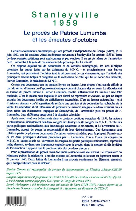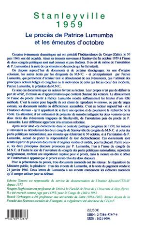 Certains événements dramatiques qui ont précédé l'indépendance du Congo (.Zaïre), le 30 juin 1960, ont été occulté. Ainsi les émeutes survenues à Stanleyville fin octobre 1959 à l'issue de deux congrès politiques sont mal connues et peu étudiées. Il en est de même de l'arrestation de P. Lumumba à la suite de ces émeutes et du procès qui lui fut intenté.