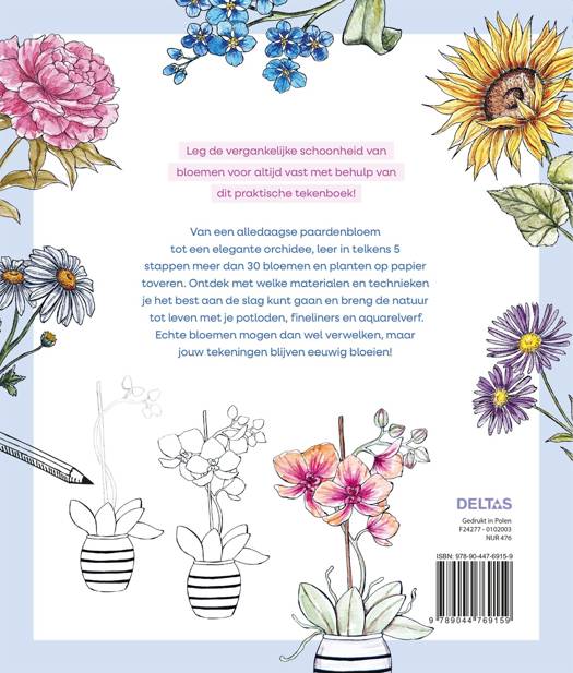 Leg de vergankelijke schoonheid van bloemen voor altijd vast met behulp van dit praktische tekenboek! Van een alledaagse paardenbloem tot een elegante orchidee, leer in telkens 5 stappen meer dan 30 bloemen en planten op papier toveren. Ontdek met welke materialen en technieken je het best aan de slag kunt gaan en breng de natuur tot leven met je potloden, fineliners en aquarelverf. Echte bloemen mogen dan wel verwelken, maar jouw tekeningen blijven eeuwig bloeien!