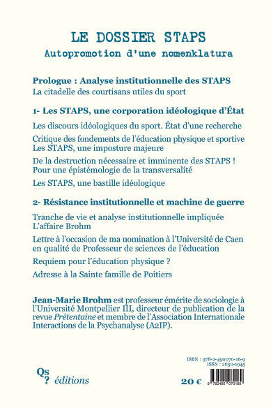 Je voudrais procéder ici à une contextualisation institutionnelle permettant de comprendre le degré zéro de l’épistémologie naïve des STAPS. Cette analyse provoquera de toute évidence de fortes résistances de la part de la « Corporation » du fait précisément que l’idéologie scientiste rétrograde de ce groupe corporatiste (comme peut l’être un syndicat de camionneurs, de chauffeurs-taxis ou de viticulteurs) auto-légitimé, auto-proclamé, auto-recruté s’appuie sur des préjugés épistémologiques qui fonctionnent comme autant de mécanismes de défense ou d’arguments d’autorité qui dissimulent mal l’absence d’autorité des arguments... Pour comprendre la virulence crispée des dispositions idéologiques réactionnaires qui verrouillent la forteresse assiégée des STAPS, il faut se souvenir que des intérêts épistémologiques s’étayent toujours sur des intérêts pulsionnels, que les théories scientifiques consolident ou invalident des positions sociales ou des dispositifs bureaucratiques et que les controverses de légitimité/respectabilité au sein d’un groupe de petits valets d’État renvoient toujours à de féroces luttes de concurrence sur le marché de la réussite sociale et de la promotion académique.