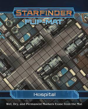 Whether the heroes want to install cybernetic augmentations in their bodies or are searching for the source of an otherworldly plague, no Game Master wants to spend time drawing every nurse's station and operating room. Fortunately, with Paizo's latest Starfinder Flip-Mat, you don't have to! This line of gaming maps provides ready-to-use science-fantasy set pieces for the busy Game Master. This double-sided map features a futuristic, high-tech medical center on one side and a sinister, abandoned infirmary on the other. Don't waste time sketching when you could be playing. With Starfinder Flip-Mat: Hospital, you'll be ready the next time your players need medical treatment for their injuries!