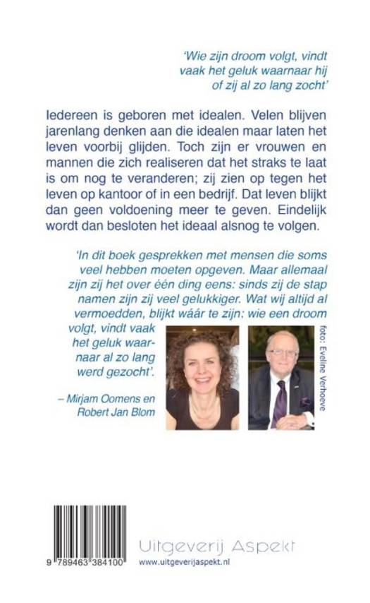 'In dit boek gesprekken met mensen die soms veel hebben moeten opgeven. Maar allemaal zijn zij het over één ding eens: sinds zij de stap namen zijn zij veel gelukkiger. Wat wij altijd al vermoedden, blijkt wáár te zijn: wie een droom volgt, vindt vaak het geluk waarnaar al zo lang werd gezocht'.