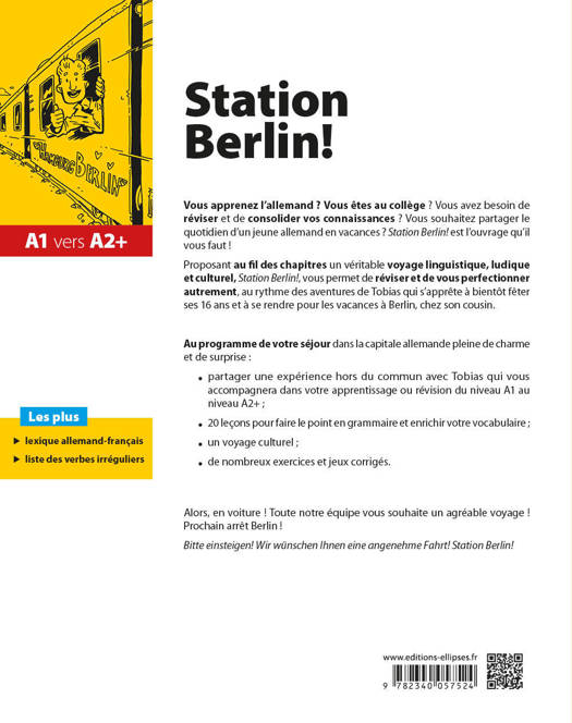 À destination des collégiens germanistes de la 6e à la 3e, Station Berlin ! permet deréviser et de consolider ses connaissances au rythme des aventures de Tobias qui s’apprête à se rendre chez son cousin pour les vacances, à Berlin.