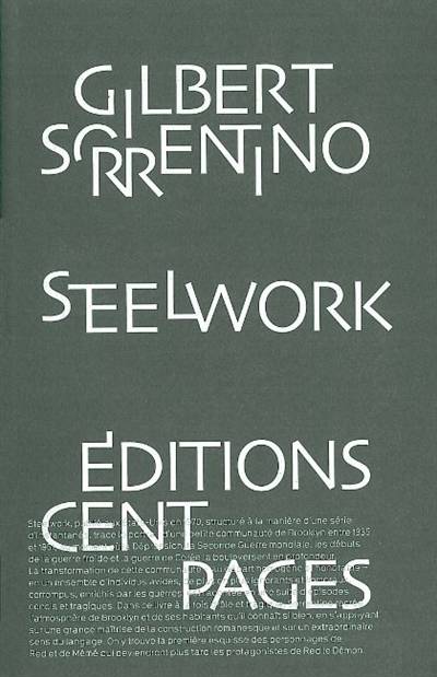 Steelwork, publié aux États-Unis en 1970, structuré à la manière d’une série d’instantanés, trace le portrait d’une petite communauté de Brooklyn entre 1935 et 1951, au moment où la Dépression, la Seconde Guerre mondiale, les débuts de la guerre froide et la guerre de Corée la bouleversent en profondeur. La transformation de cette communauté – au départ homogène et honorable – en un ensemble d’individus avides, de plus en plus ignorants et immoraux, corrompus, enrichis par les guerres, est racontée en une suite d’épisodes concis et tragiques. Cette communauté de quartier d’où se détachent quelques individus qui nous deviennent familiers au fil de leurs apparitions répétées dans divers épisodes est bien le personnage principal de ce roman. À la manière des souvenirs, ces épisodes narratifs ne suivent pas une chronologie mais éclairent des fractions du passé. Dans ce livre à la fois drôle et tragique, Gilbert Sorrentino recrée l’atmosphère du Brooklyn qu’il connaît si bien et de ses habitants, en se fondant sur une grande maîtrise de la construction romanesque et sur un extraordinaire sens du langage. On y trouve la première esquisse des personnages de Red et de Mémé qui deviendront plus tard les protagonistes de Red le Démon.