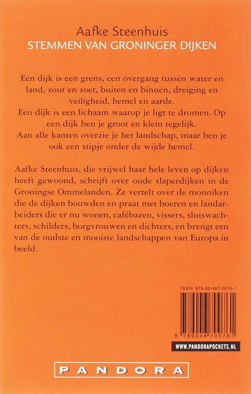 Aafke Steenhuis, die vrijwel haar hele leven op dijken heeft gewoond, schrijft over oude slaperdijken in de Groningse Ommelanden. Ze vertelt over de monniken die de dijken bouwden en praat met mensen die er nu wonen. Boeren en landarbeiders, cafébazen, vissers, sluiswachters, schilders, borgvrouwen en dichters, en brengt een van de oudste en mooiste landschappen van Europa in beeld. Een dijk is een grens, een overgang tussen water en land, zout en zoet, buiten en binnen, dreiging en veiligheid, hemel en aarde. Een dijk is een lichaam waarop je ligt te dromen. Op een dijk ben je groot en klein tegelijk, aan alle kanten overzie je het landschap, maar je bent ook een stipje onder de wijde hemel.