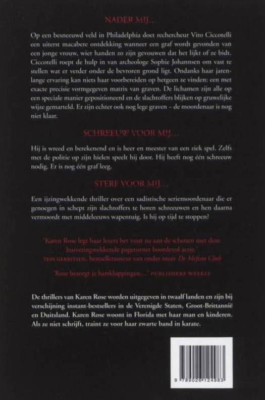 Op een besneeuwd veld in Philadelphia doet rechercheur Vito Ciccotelli een uiterst macabere ontdekking wanneer een graf wordt gevonden van een jonge vrouw, haar handen zijn zo gevouwen dat het lijkt of ze bidt. In deze psychologische thriller roept Ciccotelli de hulp in van archeoloog Sophie Johannsen om vast te stellen wat er verder onder de bevroren grond ligt. Ondanks haar jarenlange ervaring kan niets Sophie voorbereiden op hetgeen ze vinden: een met nauwkeurig vormgegeven matrix van graven. De lichamen zijn allemaal op een speciale manier neergelegd en de slachtoffers blijken op gruwelijke wijze gemarteld, wat de spanning tot het uiterste opvoert. Er zijn echter ook nog lege graven en in deze psychologische thriller en misdaadroman van Karen Rose is de moordenaar nog lang niet klaar… Sterf voor mij is een psychologische en romantische thriller met een rauw randje: duister, meeslepend en onverwachts. Een Amerikaanse misdaadroman vol spanning en emotie, voor lezers die houden van psychologische diepgang en een hoog tempo. Voor fans van Karin Slaughter, Tess Gerritsen en Nora Roberts.