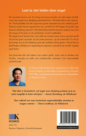Wanneer je dit boek leest, is het niet langer meer nodig om angst te ervaren voor afwijzing. De auteur Jia Jiang was zelf doodsbang voor afwijzing en besloot daar op een dag iets aan te doen. Zijn grootste droom om baas te worden van een eigen bedrijf werd weerhouden door zijn angst voor afwijzing. Hij belandde in een depressie. Om zijn angst te overwinnen stelde hij 100 dagen lang de meest onmogelijke vragen aan vreemden op straat. Deze 100 uitdagingen staan op YouTube en kun je zelf ook proberen. Jiang leerde op deze manier ‘nee’ te incasseren, maar kreeg ook verrassend vaak ‘ja’ te horen. Zijn ervaringen maakte hem sterker en hij laat jou zien op welke manieren je een vraag kunt stellen om een ‘nee’ om te buigen naar een ‘ja’.
