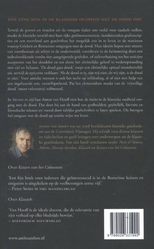Grieken en Romeinen hadden een fantastische verscheidenheid aan opvattingen over de dood. In Sterven in stijl laat Anton van Hooff zien hoe de mens in de oudheid omging met de dood. Dat doet hij aan de hand van grafbeelden, grafreliëfs, literaire en filosofische teksten en vooral door talrijke grafschriften te laten spreken. Ze brengen het omgaan met de dood op unieke wijze tot leven.