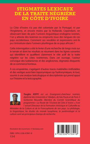 La Côte d’Ivoire n’a pas été colonisée par le Portugal, ni par l’Angleterre, et encore moins par la Hollande. Cependant, en observant bien de près l’univers linguistique endogène ivoirien, l´on y atteste des lexèmes ou emprunts issus des langues de ces pays occidentaux. Comment ces vocables et expressions ont-ils pu s’introduire dans l’univers plurilingue de ce pays africain ? Cette interrogation a été le levier d’une recherche de longs mois sur le terrain et dont les résultats se résument dans les lignes suivantes qui identifient et qualifient clairement le rôle actif de la traite négrière sur les côtes Ivoiriennes. Dans cet ouvrage, l´auteur convoque des lusitanismes et des anglicismes, stigmates éloquents de ce commerce honteux. A ces empreintes, s’agrègent d’autres traces matérielles irréfutables et des vestiges aussi bien toponymiques qu´hydronymiques, le tout, soumis à une analyse lexicologique et descriptiviste qui prend appui sur l’histoire et la lexicographie.