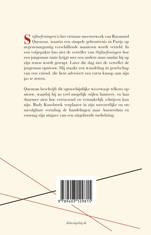 Queneau beschrijft dit ogenschijnlijke wissewasje telkens opnieuw, waarbij hij zo veel mogelijk stijlen hanteert, en laat daarmee zien hoe verrassend en vermakelijk schrijven kan zijn. Rudy Kousbroek verplaatst in zijn meesterlijke en onnavolgbare vertaling de handelingen naar Amsterdam en voorzag zijn uitgave van een uitgebreide toelichting.