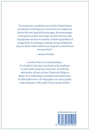 "Stille confetti" is een lofzang op het leven, over de waarheden die schuilen achter de woorden en over de vele smaken van water. Wie Carolien Frijns leest, kan niet anders dan het leven weer (mooi) vinden.