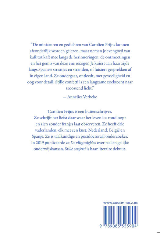 Het leven laat zich niet temmen: altijd zijn er nieuwe mogelijkheden, nieuwe stemmen. Carolien Frijns luistert naar de onbekenden om haar heen, op terrasjes in de zon en aan de toog van koffiebarretjes in Spanje, België en Nederland. Ze praat met ontwortelden die een nieuw leven vonden, met mensen die onderweg zijn. En zoals mensen elkaar altijd weer vinden, zo vinden ook haar stukjes elkaar: ze schuiven in elkaar als een matroesjka-pop. "Stille confetti" is een lofzang op het leven, over de waarheden die schuilen achter de woorden en over de vele smaken van water.