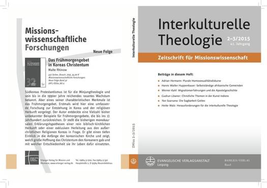 Die 'Interkulturelle Theologie. Zeitschrift fur Missionswissenschaft' erscheint in Fortfuhrung des Evangelischen Missions-Magazins (seit 1816) und der Evangelischen Missions-Zeitschrift. Sie reflektiert die theologischen Grundlagen der Mission (Missionstheologie) sowie Erfahrungen und Probleme der weltweiten missionarischen Praxis. Sie bringt Beitrage und Analysen zu missionsgeschichtlichen Themen, widmet sich missionswissenschaftlich relevanten ethnologischen, religions- und kulturwissenschaftlichen Forschungsergebnissen und beteiligt sich an interreligiosen und interkulturellen Dialogen. Im Vordergrund steht das Bemuhen um Respekt und ein besseres Verstandnis anderer Glaubensweisen, die Unterstutzung von auf den jeweiligen Kontext bezogenen Theologien und das Gesprach mit uberseeischen Theologinnen und Theologen. Die 'Interkulturelle Theologie' informiert zudem regelmassig in verschiedenen Rubriken uber aktuelle Entwicklungen, Ereignisse und Neuerscheinungen. Schriftleitung: Hauptschriftleiter: Ulrich Dehn (Hauptschriftleiter), Moritz Fischer, Klaus Hock, Katrin Kusmierz, Benedict Schubert