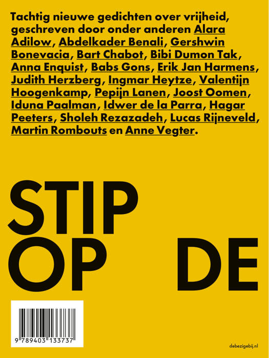 Stip op de horizon bevat tachtig nieuwe gedichten, geschreven door dichters als Alara Adilow, Abdelkader Benali, Gershwin Bonevacia, Bart Chabot, Anna Enquist, Babs Gons, Erik Jan Harmens, Valentijn Hoogekamp, Judith Herzberg, Ingmar Heytze, Pepijn Lanen, Joost Oomen, Iduna Paalman, Hagar Peeters, Idwer de la Parra, Lucas Rijneveld, Martin Rombouts, Bibi Dumon Tak en Anne Vegter.
