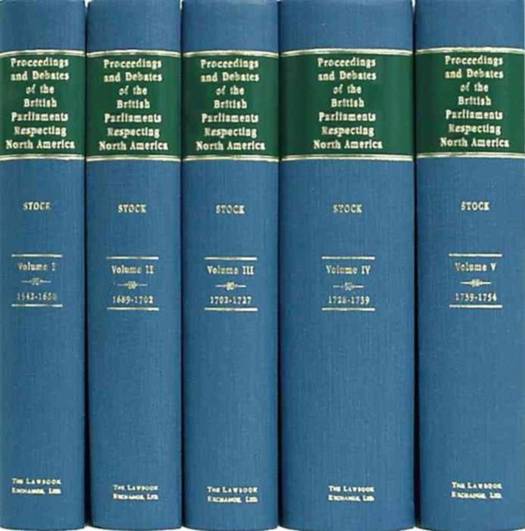 A useful source for the admiralty, maritime or commercial law historian. Originally published: Washington, D.C.: The Carnegie Institution of Washington, 1924. xx, 515; xv, 564; xxvi, 571; xxviii, 888; xxv, 658 pp. This five volume set collects all references to North America in the proceedings and debates of the parliaments of England, Scotland and Ireland recorded between 1542 and 1754. The "proceedings" are taken from the officially published Journals; the "debates" are taken from several sources, such as the transcripts of Parliamentary sessions published in the Gentlemen's Magazine. The scope of the work is not confined to North America; it includes all items relating directly or by implication to Canada, Central America, South America, the Caribbean, the Philippines and Africa. It also includes items relating to the navigation acts, the Royal African Company and the Asientos, and all legislation concerning enactments, repeals or alterations of duties and other acts concerning tobacco, sugar, coffee, furs, indigo, whale products and other colonial products.