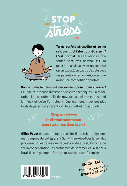 Ce livre te propose d’essayer plusieurs techniques : la méditation, la respiration… Tu découvriras laquelle te correspond le mieux et qu’en t’entraînant régulièrement, il devient plus facile de gérer ton stress. Alors, tu es prêt(e) ? C’est parti !