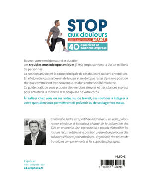 Stop à la sédentarité : Retrouver mobilité et bien-être au travail. Ancien sportif de haut niveau en voile, préparateur physique et expert en prévention des troubles musculosquelettiques (TMS) en entreprise, Christophe André a conçu cet ouvrage comme un véritable guide pratique pour lutter contre les effets délétères de la position assise prolongée. Prise de poids, fonte musculaire, perte de souplesse, douleurs chroniques au cou, aux épaules, au dos, et même sciatiques... Ces troubles ne sont pas une fatalité ! À travers des exercices simples, des séances types et des conseils concrets, ce livre vous apporte des solutions accessibles à tous pour préserver votre santé, améliorer votre posture et retrouver de l'énergie au quotidien. Que vous soyez en télétravail, en open space ou sur un poste sédentaire, vous découvrirez comment intégrer facilement des routines efficaces pour bouger plus et souffrir moins. Un guide essentiel pour prendre soin de son corps et booster sa performance professionnelle !