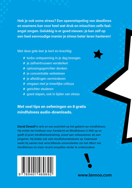 David Dewulf ontwikkelde als eerste een mindfulnesstraining speciaal voor jongeren en weet als geen ander hoe hij de principes van mindfulness en compassie naar hun leefwereld kan vertalen. In deze praktische SOS-survivalgids bundelt hij enkele krachtige oefeningen die het zelfvertrouwen van leerlingen en studenten een boost geven, hun concentratie en zelfvertrouwen verhogen en faalangst verminderen. Bovendien toont hij ook hoe ze gericht en efficiënt kunnen ontspannen en hun nachtrust kunnen verbeteren.