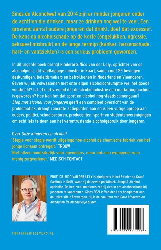 Sinds de Alcoholwet van 2014 zijn er minder jongeren onder de achttien die drinken, maar ze drinken nog wel te veel. Een groeiend aantal oudere jongeren dat drinkt, doet dat excessief. De kans op alcoholschade op de korte (ongelukken, agressie, seksueel misbruik) en de lange termijn (kanker, hersenschade, hart- en vaatziekten) is een serieus probleem geworden. In dit urgente boek brengt kinderarts Nico van der Lely, oprichter van de alcoholpoli's, dit veelkoppige monster in kaart, samen met 25 bevlogen deskundigen, beleidsmakers en betrokkenen in Nederland en Vlaanderen. Geven wij als volwassenen met onze eigen alcoholconsumptie wel het goede voorbeeld? Is het niet vreemd dat de alcoholindustrie een marketingmachine is geworden? Hoe kan het dat sport en alcohol nog steeds samengaan? Stop met alcohol voor jongeren geeft een compleet overzicht van de problematiek, draagt concrete actiepunten aan en is een vurige oproep aan ouders, politici, schoolbesturen, producenten, sport- en studentenverenigingen om echt iets te doen aan het verontrustende alcoholgebruik door jongeren.