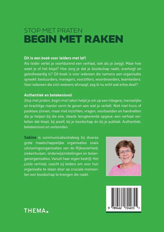 Dit is een boek voor leiders met lef! Als leider vertel je voortdurend een verhaal, ook als je zwijgt. Maar hoe weet je of het klopt? Hoe zorg je dat je boodschap raakt, overtuigt en geloofwaardig is? Dit boek is voor iedereen die namens een organisatie spreekt: bestuurders, managers, voorzitters, woordvoerders, teamleiders. Voor iedereen die zich weleens afvraagt: zeg ik nu echt wat ertoe doet?