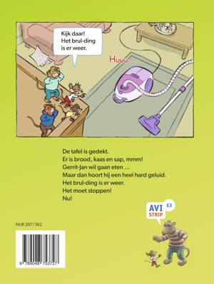 De tafel is gedekt. Er is brood, kaas en sap, mmm! Gerrit-Jan wil gaan eten … Maar dan hoort hij een heel hard geluid. Het brul-ding is er weer. Het moet stoppen! Nu!