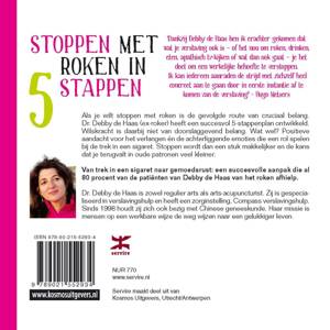 De meeste rokers willen stoppen, maar slechts een klein percentage slaagt daarin. De gevolgde route is daarbij van cruciaal belang. Dr. Debby de Haas (ex-roker) heeft een succesvol 5-stappenplan ontwikkeld. Wilskracht is daarbij niet van doorslaggevend belang. Wat wel? Positieve aandacht voor het verlangen én de achterliggende emoties die een rol spelen bij de trek in een sigaret. Stoppen wordt dan een stuk makkelijker en de kans dat je terugvalt in oude patronen veel kleiner. Van trek in een sigaret naar gemoedsrust: een succesvolle aanpak die al 80 procent van de patiënten van Debby de Haas van het roken afhielp.