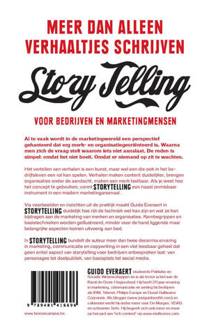 Storytelling is meer dan alleen verhaaltjes Al te vaak wordt in de marketingwereld een perspectief gehanteerd dat erg merk- en organisatiegeoriënteerd is. Waarna men zich de vraag stelt waarom iets niet aanslaat. De reden is simpel: omdat het niet boeit. Omdat er niemand op zit te wachten. Het vertellen van verhalen is een kunst, maar wel een die ook in het bedrijfsleven een rol kan spelen. Verhalen maken content duidelijker, brengen organisaties onder de aandacht, maken een merk tastbaar. Als je weet hoe het concept te gebruiken, vormt Storytelling een haast onmisbaar instrument in een modern marketingarsenaal. Via voorbeelden en inzichten uit de praktijk maakt Guido Everaert in Storytelling duidelijk hoe rijk de techniek wel kan zijn en wat ze kan bijdragen aan de marketing van merken en organisaties. Kernbegrippen en basistechnieken worden geïllustreerd, minder voor de hand liggende maar belangrijke aspecten komen uitvoerig aan bod. In Storytelling bundelt de auteur meer dan twee decennia ervaring in marketing, communicatie en copywriting in een vlot leesbaar geheel dat geen enkel aspect van storytelling voor bedrijven onbesproken laat: van personages tot doelpubliek, van basisplots tot social media.
