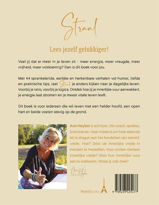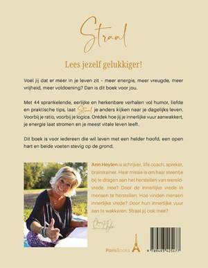 Straal Lees jezelf gelukkiger! Voel jij dat er méér in je leven zit – meer energie, meer vreugde, meer vrijheid, meer voldoening? Dan is dit boek voor jou. Met 44 sprankelende, eerlijke en herkenbare verhalen vol humor, liefde en praktische tips, laat Straal je anders kijken naar je dagelijks leven. Voorbij je ratio, voorbij je logica. Ontdek hoe jij je innerlijke vuur aanwakkert, je energie laat stromen en je meest vitale leven leeft. Dit boek is voor iedereen die wil leven met een helder hoofd, een open hart en beide voeten stevig op de grond. Ann Heylen is schrijver, life coach, spreker, braintrainer. Haar missie is om haar steentje bij te dragen aan het herstellen van wereldvrede. Hoe? Door de innerlijke vrede in mensen te herstellen. Hoe vinden mensen innerlijke vrede? Door hun innerlijke vuur aan te wakkeren. Straal jij ook mee?