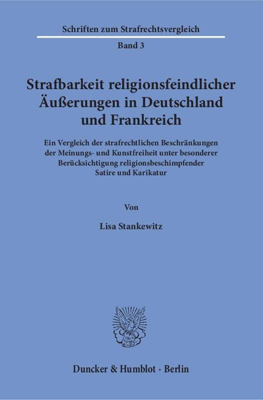 Die Arbeit stellt zunächst die kollidierenden Interessen und ihre verfassungsrechtliche Untermauerung gegenüber und arbeitet jeweils die Strafnormen heraus, die in Deutschland und Frankreich auf religionsfeindliche Äußerungen angewandt werden können. Der Vergleich beider Normenkomplexe zeigt, dass das deutsche Recht eher einen Schutz des öffentlichen Friedens verfolgt, während das französische Recht vorwiegend die einzelnen Gläubigen im Blick hat. Lisa Stankewitz stellt die Vorteile letzterer Variante heraus und erklärt, warum ein Blick über die Grenze für das deutsche Strafrecht lohnenswert ist.