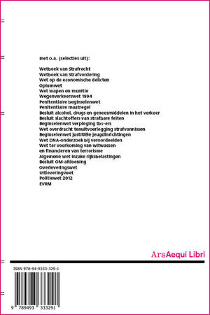 Wetboek van Strafrecht Wetboek van Strafvordering Wet op de economische delicten Opiumwet Wet wapen en munitie Wegenverkeerswet 1994 Penitentiaire beginselenwet Penitentiaire maatregel Besluit alcohol, drugs en geneesmiddelen in het verkeer Besluit slachtoffers van strafbare feiten Beginselenwet verpleging tbs-ers Wet overdracht tenuitvoerlegging strafvonnissen Beginselenwet justitiële jeugdinrichtingen Wet DNA-onderzoek bij veroordeelden Wet ter voorkoming van witwassen en financieren van terrorisme Algemene wet inzake rijksbelastingen Besluit OM-afdoening Overleveringswet Uitleveringswet Politiewet 2012 EVRM