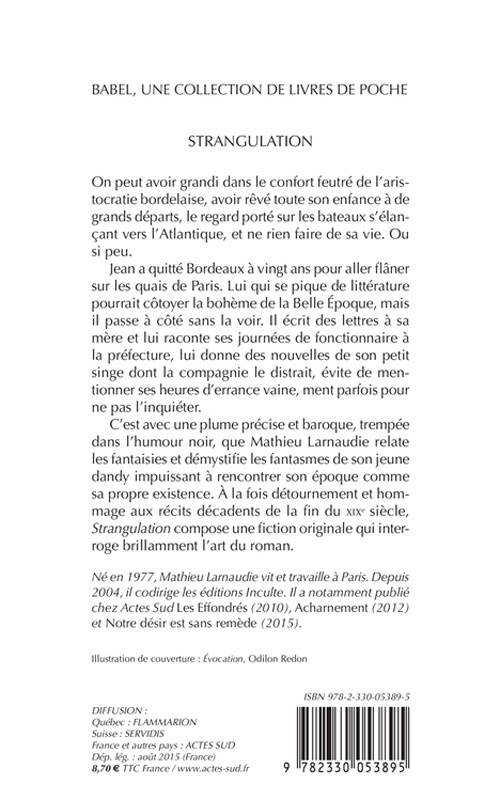 C'est avec une plume précise et baroque, trempée dans l'humour noir, que Mathieu Larnaudie relate les fantaisies et démystifie les fantasmes de son jeune dandy impuissant à rencontrer son époque comme sa propre existence. À la fois détournement et hommage aux récits décadents de la fin du XIXe siècle, «Strangulation »compose une fiction originale qui interroge brillamment l'art du roman.