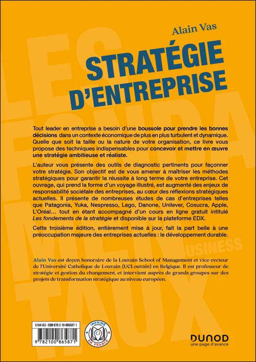 L’auteur vous présente des outils de diagnostic pertinents pour façonner votre stratégie. Son objectif est de vous amener à maîtriser les méthodes stratégiques pour garantir la réussite à long terme de votre entreprise. Cet ouvrage, qui prend la forme d’un voyage illustré, est augmenté des enjeux de responsabilité sociétale des entreprises, au coeur des réflexions stratégiques actuelles. Il présente de nombreuses études de cas d’entreprises telles que Patagonia, Yuka, Nespresso, Lego, Danone, Unilever, Cosucra, Apple, L’Oréal… tout en étant accompagné d’un cours en ligne gratuit intitulé Les fondements de la stratégie et disponible sur la plateforme EDX.