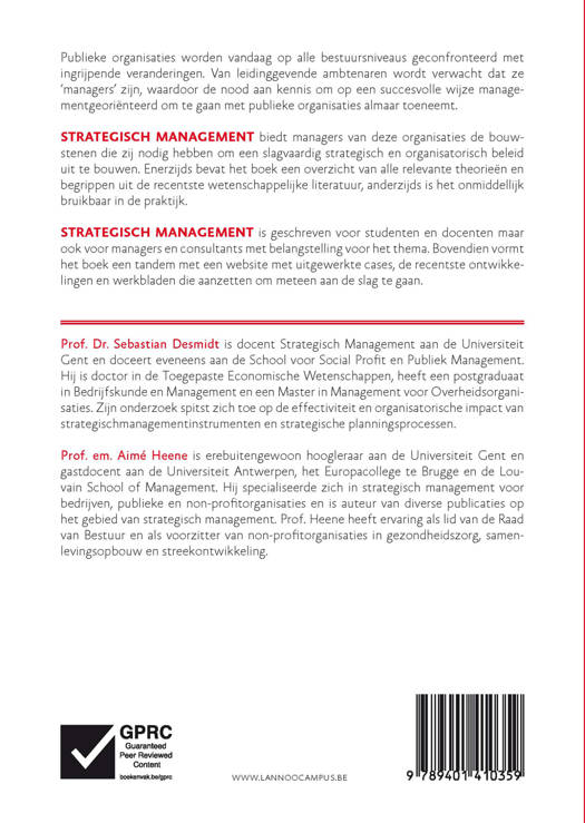 Een nieuwe overheid een nieuwe strategie Publieke organisaties worden vandaag op alle bestuursniveaus geconfronteerd met ingrijpende veranderingen. Van leidinggevende ambtenaren wordt verwacht dat ze 'managers' zijn, waardoor de nood aan kennis om op een succesvolle wijze managementgeoriënteerd om te gaan met publieke organisaties almaar toeneemt. STRATEGISCH MANAGEMENT biedt managers van deze organisaties de bouwstenen die zij nodig hebben om een slagvaardig strategisch en organisatorisch beleid uit te bouwen. Enerzijds bevat het boek een overzicht van alle relevante theorieën en begrippen uit de recentste wetenschappelijke literatuur, anderzijds is het onmiddellijk bruikbaar in de praktijk. STRATEGISCH MANAGEMENT is geschreven voor studenten en docenten maar ook voor managers en consultants met belangstelling voor het thema. Bovendien vormt het boek een tandem met een website met uitgewerkte cases, de recentste ontwikkelingen en werkbladen die aanzetten om meteen aan de slag te gaan.