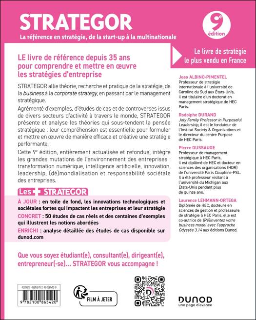 Les + STRATEGOR À JOUR : en toile de fond, les innovations technologiques et sociétales fortes qui impactent les entreprises et leur stratégie CONCRET : 50 études de cas réels et des centaines d’exemples qui illustrent les notions abordées ENRICHI : analyse détaillée des études de cas disponible sur dunod.com