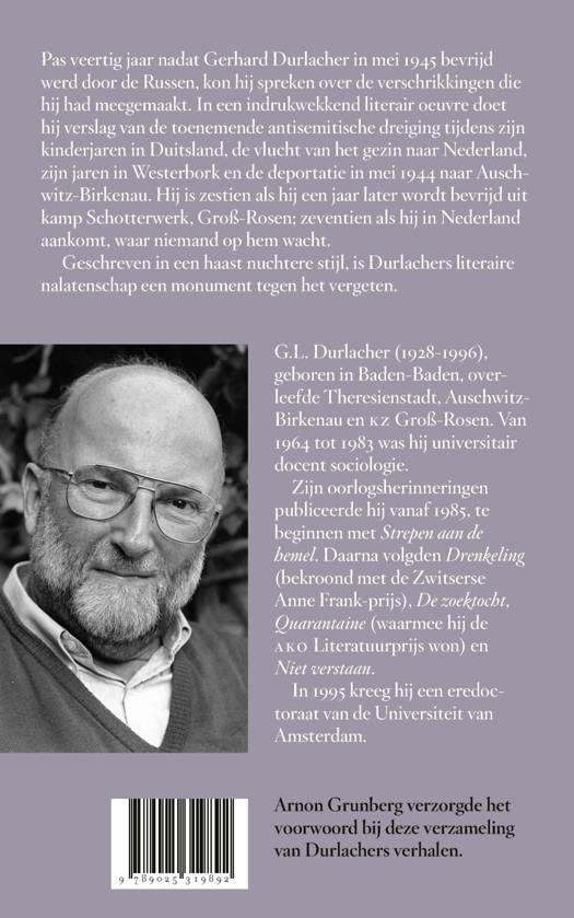 Pas veertig jaar nadat Gerhard Durlacher in mei 1945 bevrijd werd door de Russen, kon hij spreken over de verschrikkingen die hij had meegemaakt. In een indrukwekkend literair oeuvre doet hij verslag van de toenemende antisemitische dreiging tijdens zijn kinderjaren in Duitsland, de vlucht van het gezin naar Nederland, zijn jaren in Westerbork en de deportatie in mei 1944 naar Auschwitz-Birkenau. Hij is zestien als hij een jaar later wordt bevrijd uit kamp Schotterwerk, Groß-Rosen; zeventien als hij in Nederland aankomt, waar niemand op hem wacht.