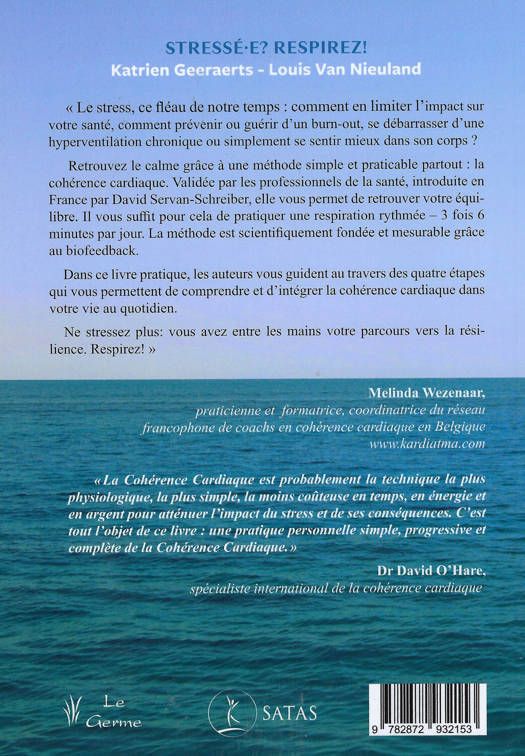 Le stress, ce fléau de notre temps : comment en limiter l'impact sur votre santé, comment prévenir ou guérir d'un burn-out, se débarrasser d'une hyperventilation chronique ou simplement se sentir mieux dans son corps ? Retrouvez le calme grâce à une méthode simple et praticable partout : la cohérence cardiaque. Validée par les professionnels de la santé, introduite en France par David Servan-Schreiber, elle vous permet de retrouver votre équilibre. Il vous suffit pour cela de pratiquer une respiration rythmée ? 3 fois 6 minutes par jour. La méthode est scientifiquement fondée et mesurable grâce au biofeedback. Dans ce livre pratique, les auteurs vous guident au travers des quatre étapes qui vous permettent de comprendre et d'intégrer la cohérence cardiaque dans votre vie au quotidien. Basé sur des recherches scientifiques, "Stressée ? Respirez ! " est le manuel par excellence pour vous guider à contrôler votre stress ! Ce livre clair et pratique sera votre coach personnel !