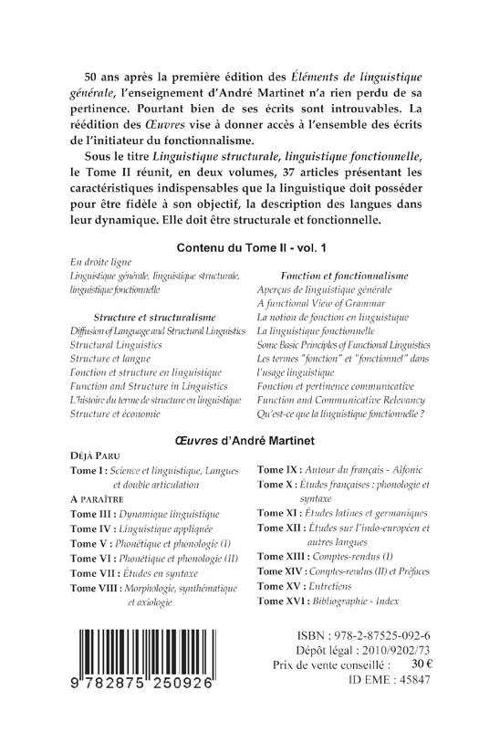 50 ans après la première édition des Éléments de linguistique générale, l’enseignement d’André Martinet n’a rien perdu de sa pertinence. Pourtant bien de ses écrits sont introuvables. La réédition des Œuvres vise à donner accès à l’ensemble des écrits de l’initiateur du fonctionnalisme. Sous le titre Linguistique structurale, linguistique fonctionnelle, le Tome II réunit, en deux volumes, 37 articles présentant les caractéristiques indispensables que la linguistique doit posséder...