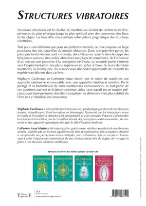 ''Structures vibratoires'' est le résultat de nombreuses années de recherche et d’expériences du plan physique jusqu’au plan spirituel avec des personnes, des lieux et des objets. Ce livre offre une synthèse cohérente et pragmatique des structures vibratoires. Tant pour une initiation que pour un perfectionnement, ce livre propose un large panorama des lois naturelles du monde vibratoire. Dans une première partie, les principes fondamentaux sont introduits, des chakras au ressenti dans le corps des fréquences sonores, des ondes vibratoires aux plans de conscience, de l’influence d’un lieu sur une personne à la perception de l’aura. La seconde partie s’oriente vers l’expérimentation des plans supérieurs et, grâce à l’une de leurs dernières inventions, la Feeling Box, les auteurs vous donnent l’opportunité de ressentir les expériences décrites dans ce livre. Stéphane Cardinaux et Catherine Anae Martin ont le talent de combiner une approche rationnelle et mesurable avec une approche intuitive et sensible. Leur travail est un soutien précieux pour toute personne cherchant à explorer les dimensions les plus subtiles de l’être et à y cheminer en conscience.